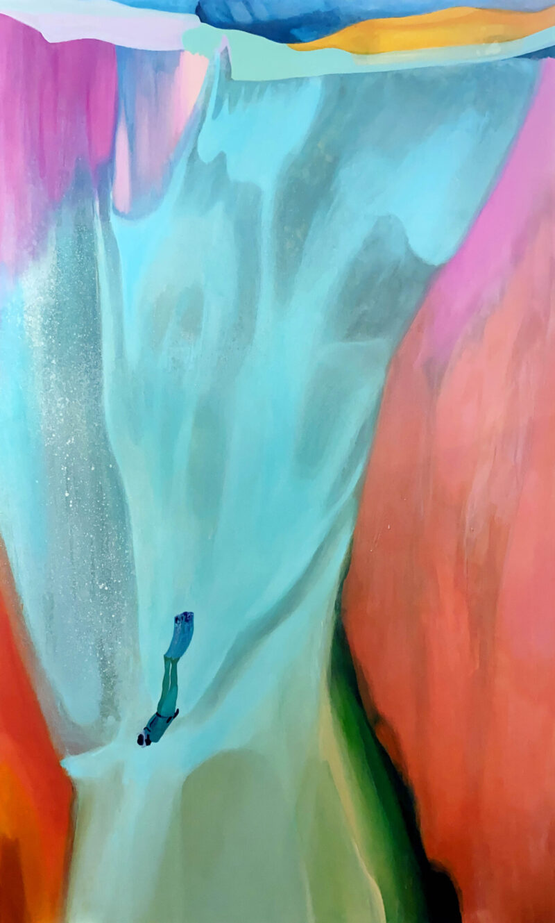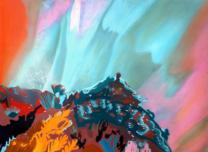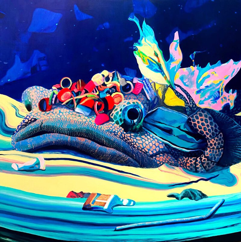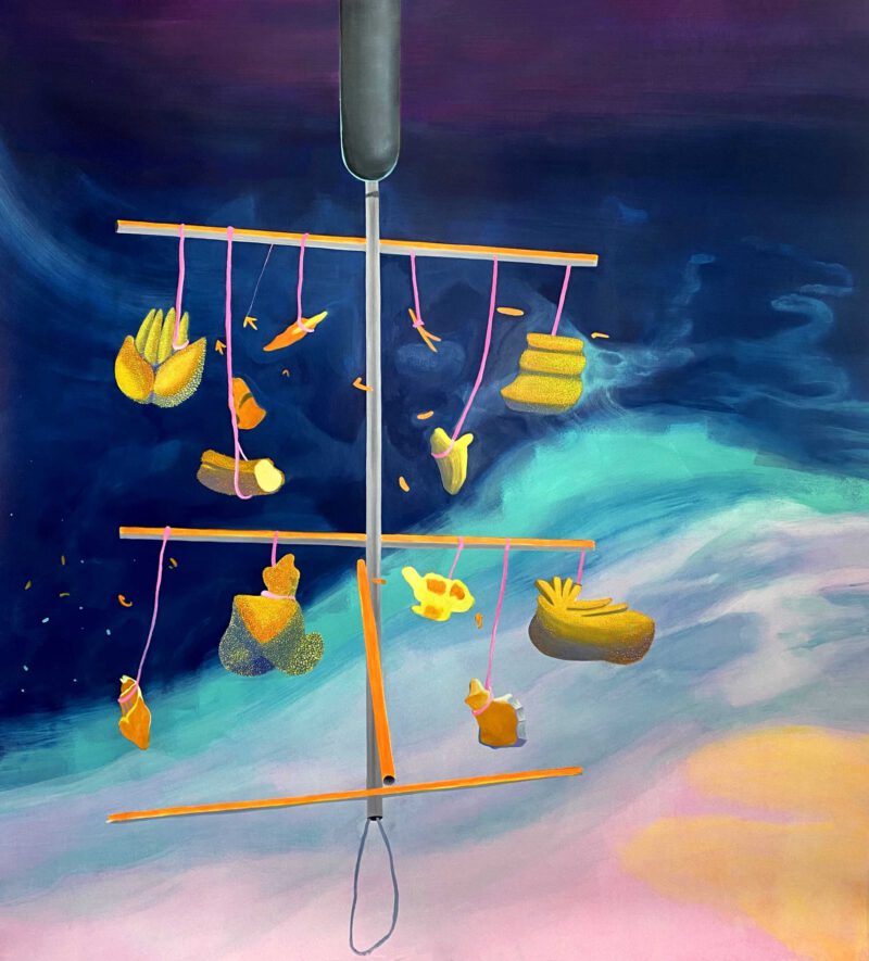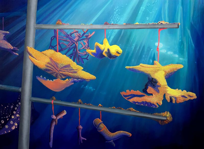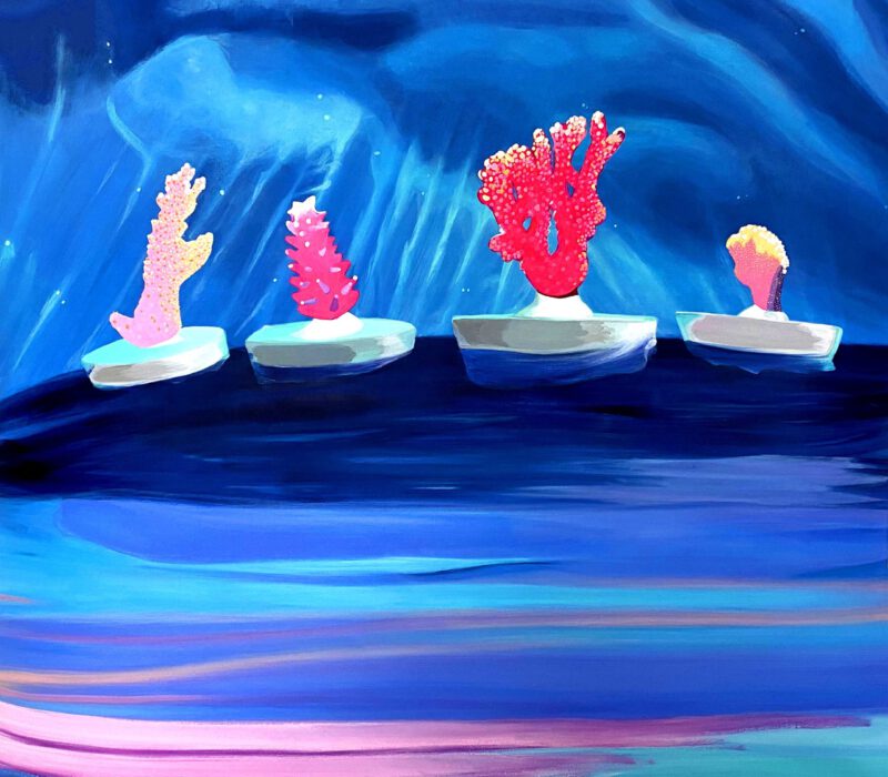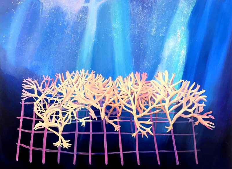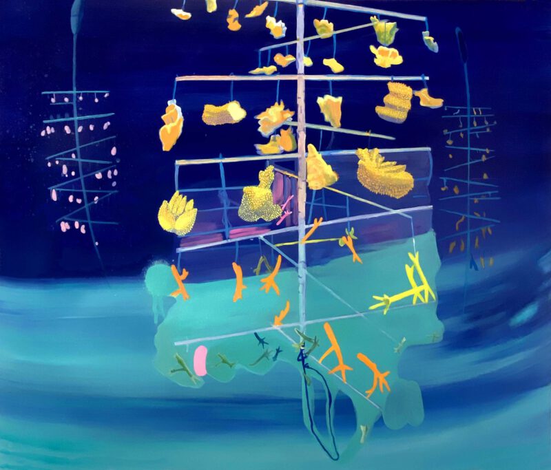 Given this alarming deterioration situation, in many parts of the world a coral gardening process has been started to replace the reefs. Although they could become one possible remedy to the coral crisis, there are still many open questions about the long-term outcome of these new crops. The series of paintings Nurseries, are inspired by this current restoration practice. Despite being full of vibrant colors, those paintings build non-organic, clearly artificial constructions. They are hybrid landscapes which remind us that even after the best recovery efforts, the damage we have done on the planet has left an indelible mark.